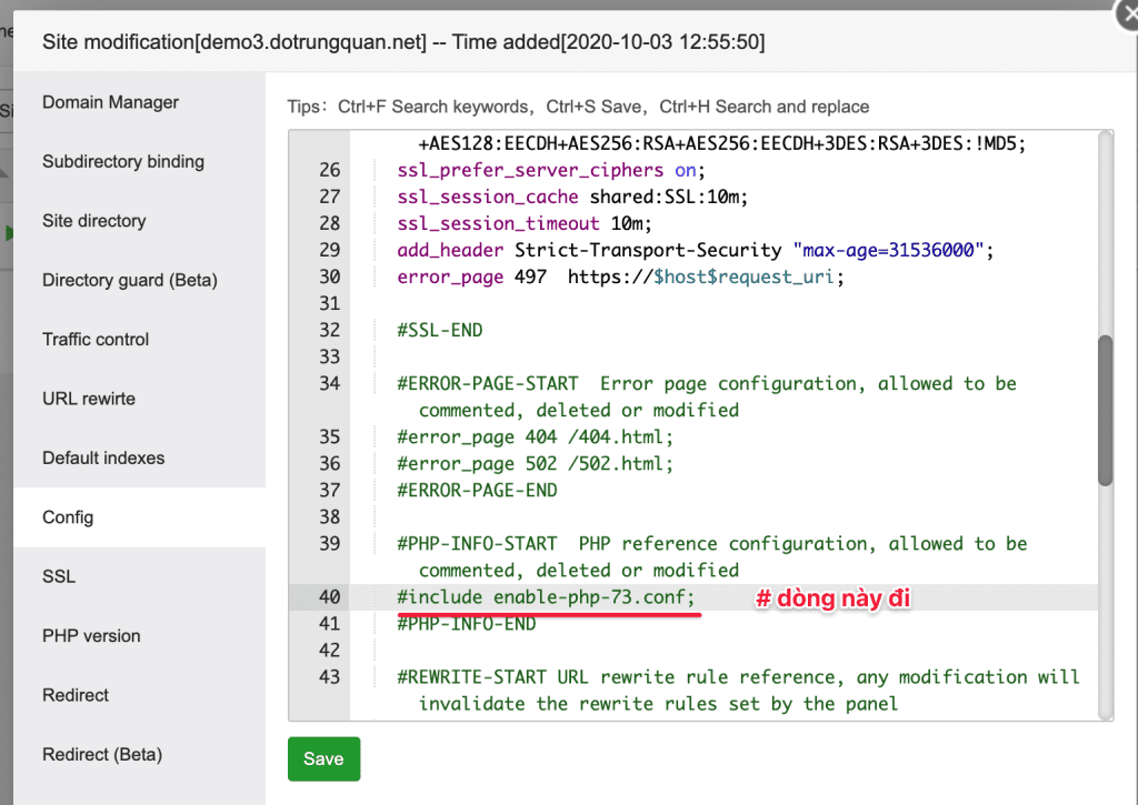 Sau đó bạn di chuyển và # dòng include enbale-php-73.conf
