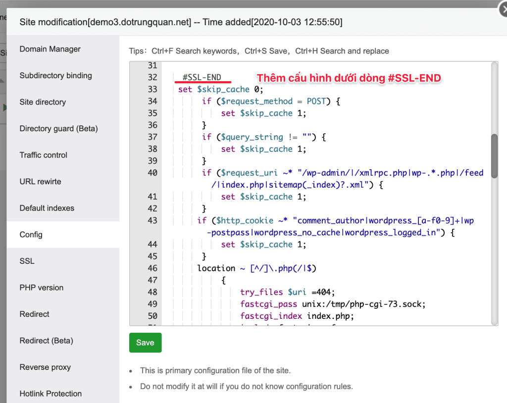 Nếu web của bạn đã cài đặt và kích hoạt SSL(HTTPS) bạn hãy thêm đoạn mã code sau vào sau dòng # SSL-END như ảnh đính kèm.