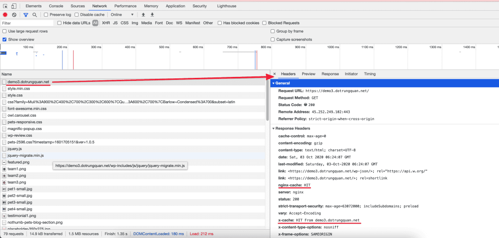 Bạn save lại các phần thiết lập và hãy mở website ở trình duyệt ẩn danh để bắt đầu kiểm tra. Bạn mử debug trình duyệt sau đó di chuyển sang Tab Netword để load. Chọn website và xem Headers cache đã HIT hay là MISS nhé.