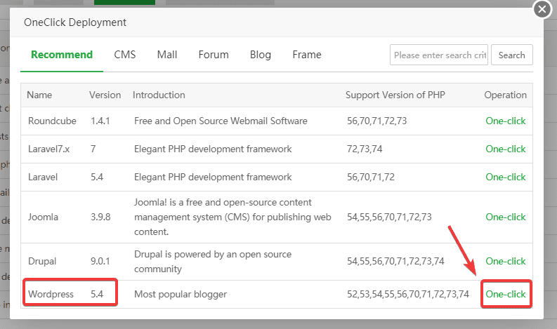 Sau khi cài đặt hoàn tất OneClick, các bạn nhấn vào One-click ở phần WordPress để tiến hành cài đặt.