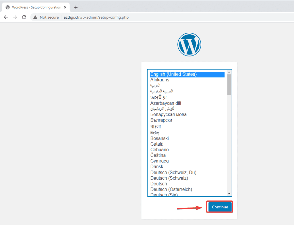Khi truy cập, WordPress sẽ yêu cầu thiết lập ngôn ngữ cho Website, bạn chọn ngôn ngữ cần sử dụng và nhấn Continue.