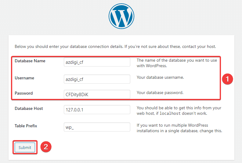 Tiếp theo tại Phần (1) các bạn điền thông tin Database đã tạo ở Bước 2 vào => Submit (2).