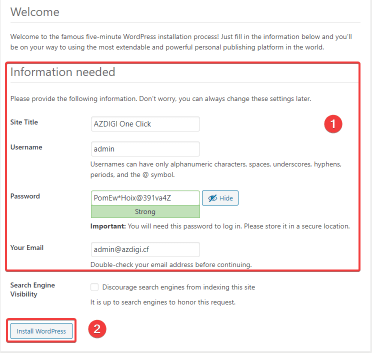 Điền đầy đủ thông tin bạn nhấn Install WordPress để hoàn tất quá trình cài đặt.