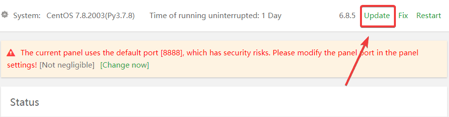 Để kiểm tra bản Update mới nhất của aaPanel, bạn nhấn vào chữ Update như hình