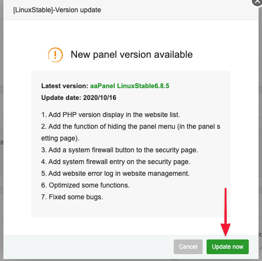 Bước 2: Cập nhật phiên bản aaPanel