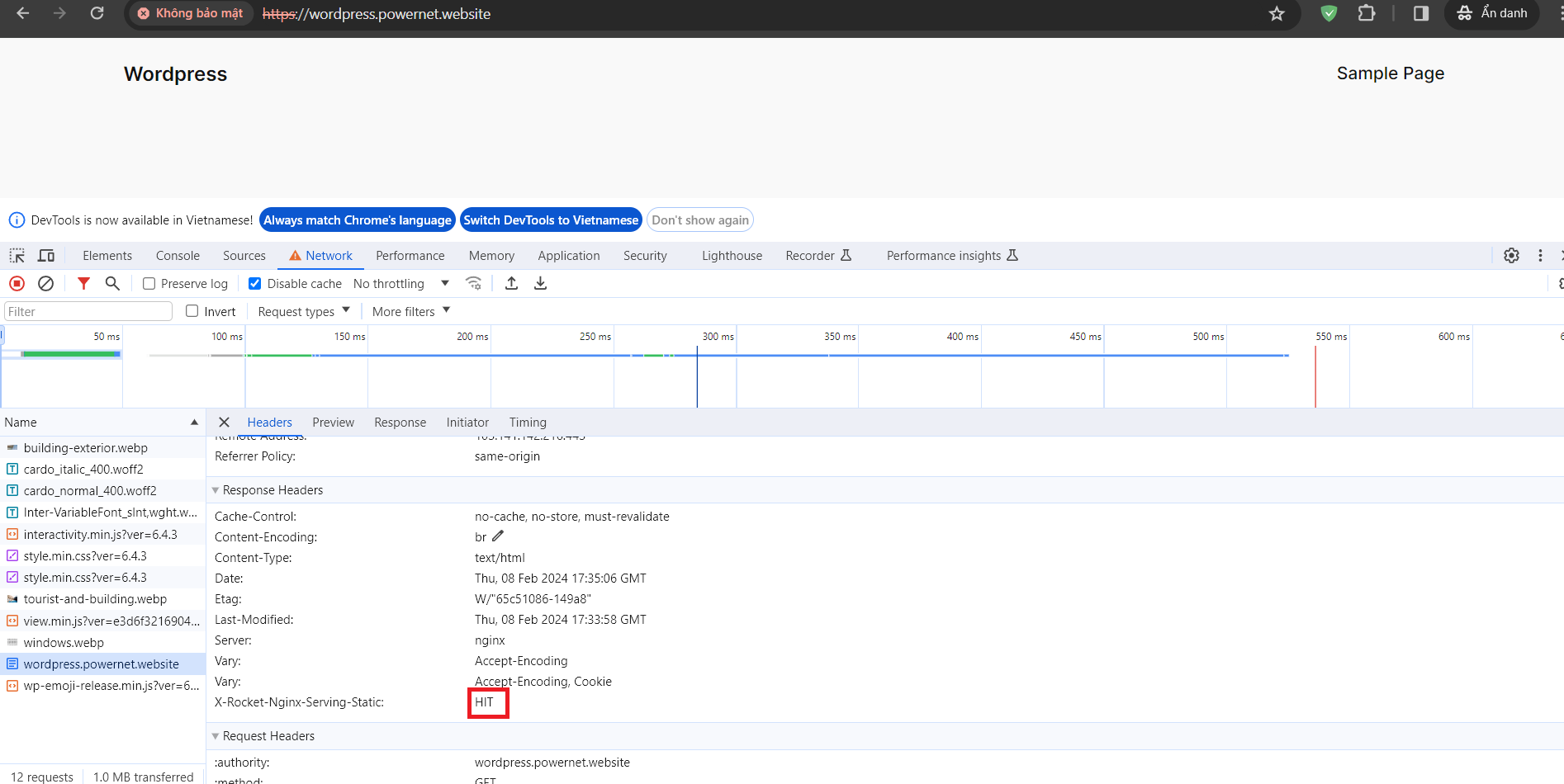 Sau khi reload xong bạn mở debug trình duyệt và kiểm tra Header nhé. Nếu hiện x-rocket-nginx-serving-static: HIT là đã thành công rồi.