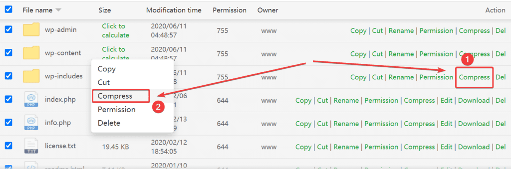 Ở đây ví dụ bạn cần backup lại mã nguồn website để download về máy tính, thì bạn tick chọn vào file cần nén hoặc chọn nén tất cả bằng cách nhấn vào Select All. Để nén file, các bạn có thể nén bằng 2 cách như sau:
