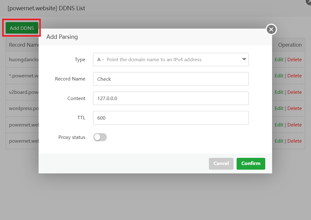 Bạn click vào Record list để vào quản lý bản ghi. Sau đó chọn Add DDNS và nhập vào bản ghi bạn muốn trỏ sau đó chọn Confirm để xác nhận.
