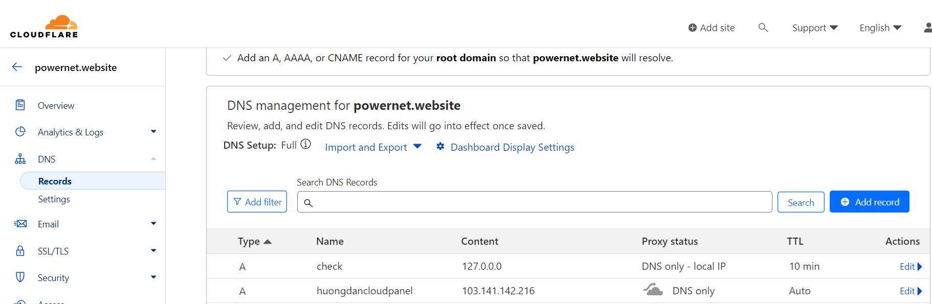 Để kiểm chứng tính hoạt động mình sẽ thực hiện các thao tác quản lý DNS ngay trên này, sau đó sẽ login vào CloudFlare kiểm tra xem thử có đồng bộ với nhau không