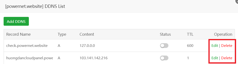 Tại giao diện quản lý DNS, bạn sẽ thấy 2 nút bao gồm Edit | Delete. 2 nút này sẽ có chức năng sửa lại bản ghi và xoá bản ghi.
